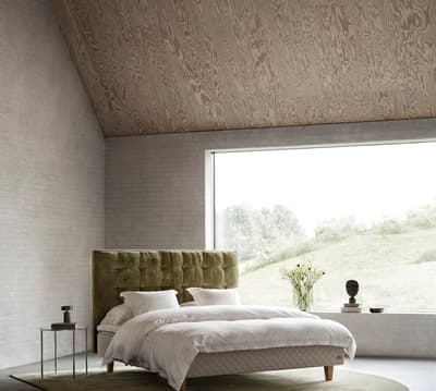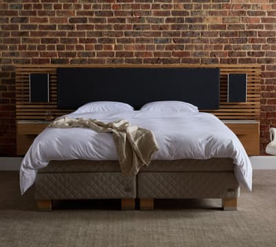 Une tête de lit en bois massif méticuleusement fabriquée, équipée de la technologie innovante Bang & Olufsen. Conçue et développée par Bang & Olufsen et DUX.